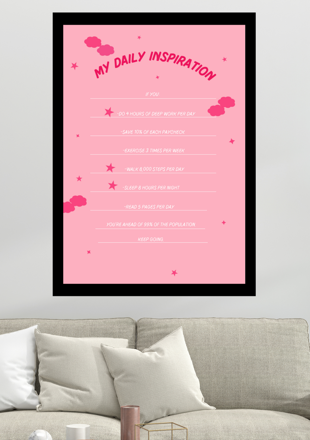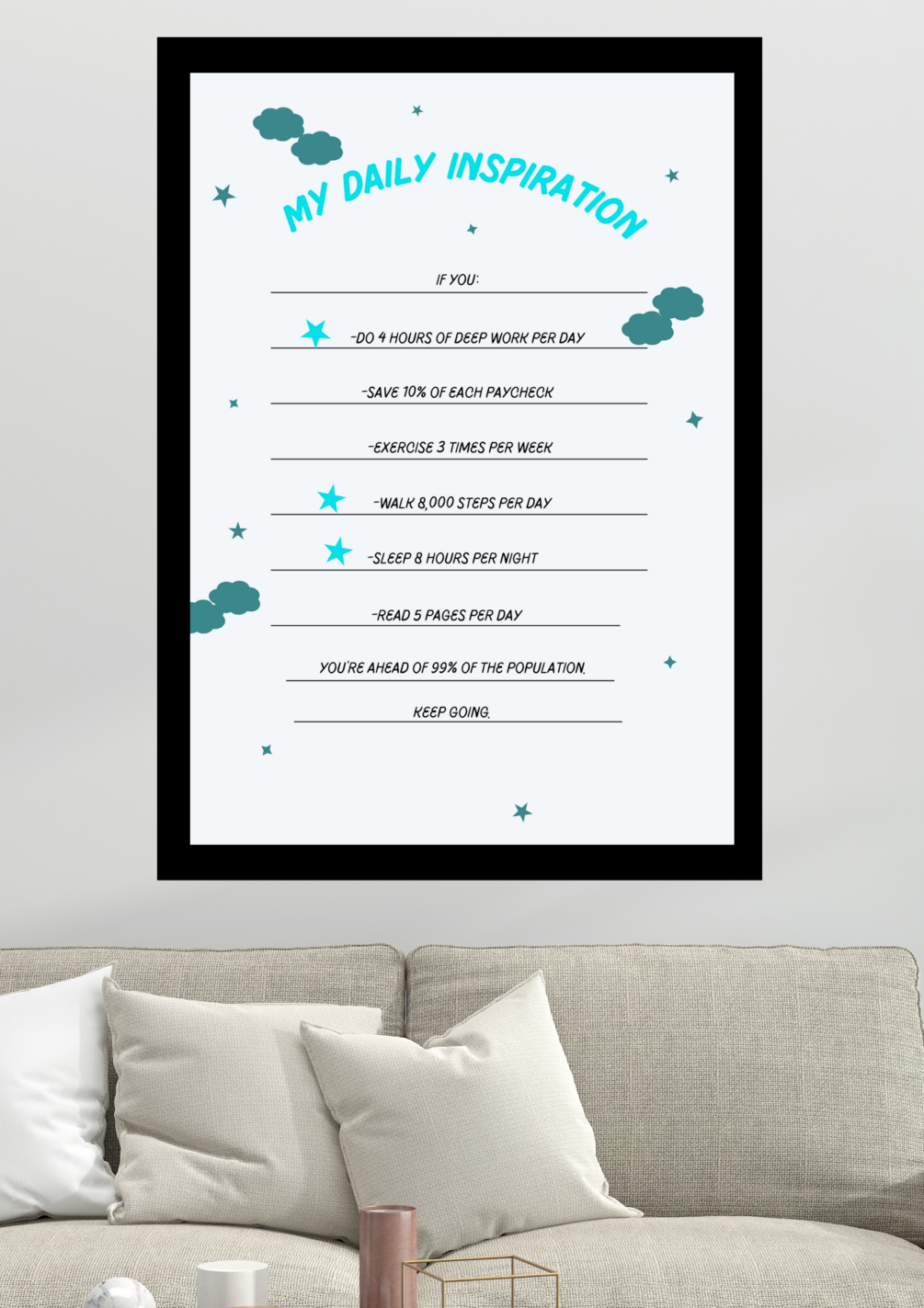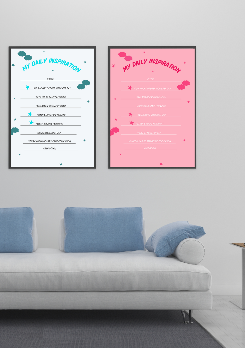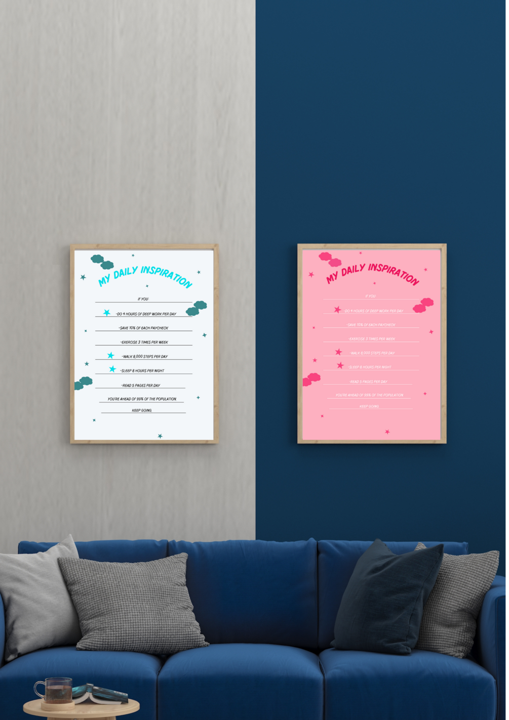 Printable and ready-to-use, our digital product allows you to effortlessly enhance your living or workspace with a touch of motivation. Simply download, print, and frame to transform any room into a haven of productivity and positivity.