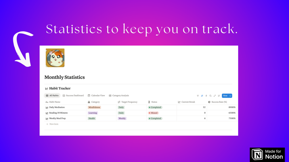 Level up your routines with the complete Notion habit tracker. Habit Glow is built for achievers who want more: detailed analytics, streak tracking, and elegant layouts that make progress feel effortless. Plan, track, and stay consistent — all in one place.