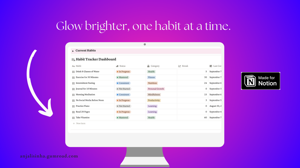 Level up your routines with the complete Notion habit tracker. Habit Glow is built for achievers who want more: detailed analytics, streak tracking, and elegant layouts that make progress feel effortless. Plan, track, and stay consistent — all in one place.