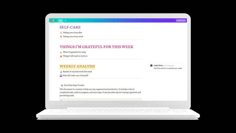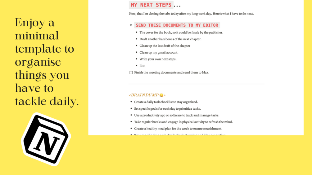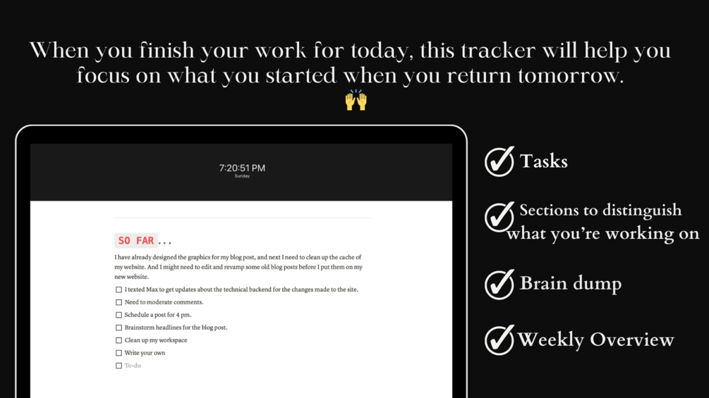 Use the bullet points and the distinct sections (So Far, Now, My Next Steps) as guiding lights to have a clear strategy on what you need to work on when you start your new work day. So, you'll have the background information to know what needs priority, and you can stay focused on your tasks.